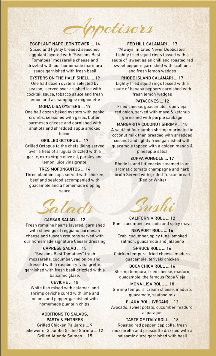 Welcome to Mona Lisa Restaurant Providence, a culinary gem located at 145 Spruce St, renowned for its exquisite blend of Latin and Italian cuisine. The menu is a vibrant tapestry of flavors, promising something for everyone. Every dish is crafted with meticulous attention to detail, ensuring both stunning presentation and delightful taste.